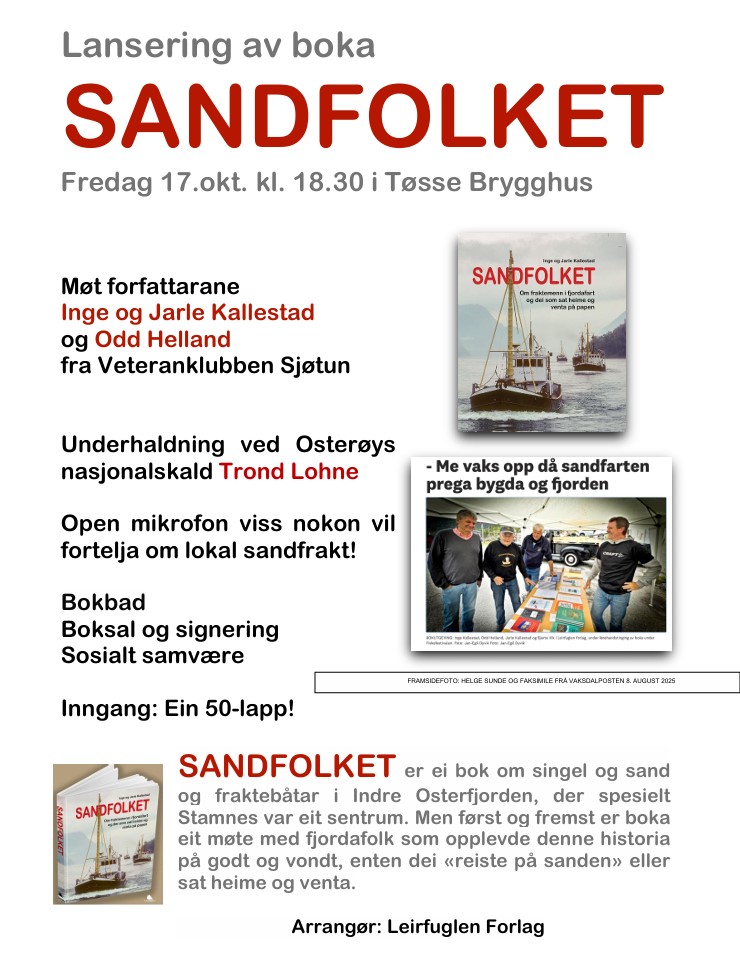Me håpar mange tar turen til Tysse Brygghus neste fredagskveld, når boka "Sandfolket" skal lanserast. Det vert møte med forfattarane, underhalding og ein god prat. Garantert både interessant, kjekt og sosialt. Det vert seld lokalproduserte varer i baren og brygghuset heldt ope utover kvelden. Håpar også nokre kan by på lokale historier frå tida med sandfrakt!